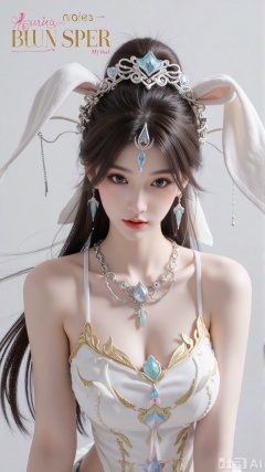 masterpiece,very aware,highres,absurdres,newest,best quality,high quality,chromatic_aberration,cinematic_angle,dutch angle, 1girl, solo, long hair, breasts, looking at viewer, open mouth, bangs, simple background, hair ornament, white background, bow, bare shoulders, upper body, heart, rabbit ears, leotard, strapless, detached collar, playboy bunny, white leotard