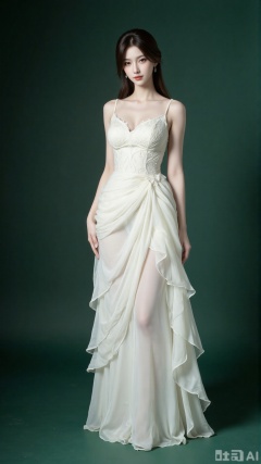 This photograph features a young Asian woman with fair skin, standing against a gradient green background that transitions from dark to light. She has a slender build, small breasts, and dark brown, slightly wavy hair styled in a loose updo with a few strands framing her face. She wears a sleeveless, white, floor-length gown with a fitted bodice and a flowing, ruffled skirt that cascades to the floor. The ruffles are delicate and semi-transparent, adding a textured, ethereal quality to the dress. She stands with a relaxed posture, her right hand gently touching her skirt, and her expression is serene and composed. The lighting is soft, highlighting the gentle folds of the fabric and the subtle details of her dress.