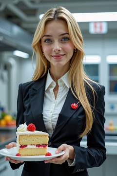 photo of a beautiful 16y.o. girl, wearing a futuristic business suit, blonde long hair, blue eyes, red pin on collar, holding a cake on a plate in a futuristic space kitchen, light smirk, warm and welcoming look,