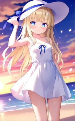 masterpiece,very aware,highres,absurdres,newest,best quality,loli,petite,high quality,chromatic_aberration,cinematic_angle,dutch angle,blurry_foreground,A light gradient background with white on top and brown at the bottom,student,"Girl",//,1girl,hat,solo,dress,blonde hair,blue eyes,long hair,petals,white dress,white headwear,smile,looking at viewer,sun hat,bangs,ribbon,sundress,outdoors,collarbone,breasts,sleeveless dress,blush,sleeveless,cloud,blue ribbon,blunt bangs,closed mouth,ocean,hand on headwear,sky,sunset,hat ribbon,bare shoulders,small breasts,//,//,official art,blurry background,depth of field,detailed light,best shadow,shiny skin,cinematic lighting,ray tracing,amazing quality,very aesthetic,absurdres,beast quality,ultra detailed,newest,8K,HDR,full_shot,//,<lora:lora:1>,