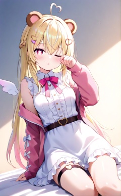 masterpiece,very aware,highres,absurdres,newest,best quality,loli,petite,high quality,chromatic_aberration,cinematic_angle,dutch angle,blurry_foreground,A light gradient background with white on top and brown at the bottom,student,"Girl",//,1girl,animal ears,solo,heart,blonde hair,dress,one eye closed,hair ornament,ahoge,long hair,white dress,braid,jacket,heart ahoge,wings,bow,virtual youtuber,frills,breasts,sitting,bangs,long sleeves,blush,pink jacket,very long hair,sleeves past wrists,off shoulder,bear ears,sleeveless,open jacket,frilled dress,rubbing eyes,sleeveless dress,;o,open clothes,looking at viewer,pink bow,medium breasts,hair between eyes,heart hair ornament,yokozuwari,bare shoulders,thigh strap,red eyes,center frills,pink eyes,puffy long sleeves,multicolored hair,hairclip,yellow bow,hand up,pink ribbon,belt,bowtie,feet out of frame,ribbon,symbol-shaped pupils,parted lips,//,//,official art,blurry background,depth of field,detailed light,best shadow,shiny skin,cinematic lighting,ray tracing,amazing quality,very aesthetic,absurdres,beast quality,ultra detailed,newest,8K,HDR,full_shot,//,<lora:lora:1>,