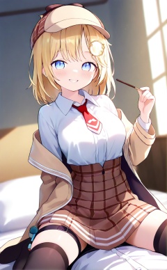 masterpiece,very aware,highres,absurdres,newest,best quality,loli,petite,high quality,chromatic_aberration,cinematic_angle,dutch angle,blurry_foreground,A light gradient background with white on top and brown at the bottom,student,"Girl",//,1girl,watson amelia,blonde hair,virtual youtuber,solo,food,pocky,blue eyes,hat,monocle hair ornament,thighhighs,hair ornament,skirt,red necktie,holding,necktie,looking at viewer,bob cut,shirt,white shirt,plaid skirt,plaid,deerstalker,holding food,black thighhighs,high-waist skirt,bangs,medium hair,thigh strap,brown headwear,coat,indoors,pleated skirt,long sleeves,breasts,collared shirt,brown skirt,smile,short necktie,blush,short hair,brown coat,zettai ryouiki,//,//,official art,blurry background,depth of field,detailed light,best shadow,shiny skin,cinematic lighting,ray tracing,amazing quality,very aesthetic,absurdres,beast quality,ultra detailed,newest,8K,HDR,full_shot,//,<lora:lora:1>,