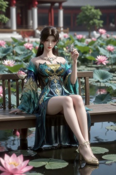 (masterpiece:1.2),best quality,The image is a digital illustration of a young woman sitting on a wooden bench in a pond with lily pads. She is wearing a long dress with design on the chest and sleeves. The dress has a high neckline and short sleeves,Holding a lo*** *n hand. She has long dark hair styled in loose waves and is wearing gold high heels. The woman is posing with one hand on her hip and the other resting on the edge of the bench. The background is filled with pink and white lotus flowers and green leaves. The overall mood of the image is peaceful and serene,(huge breasts:2.99),(full breasts:2.99),(Background with traditional Chinese architecture, lotus pond and pink lotus flowers:1.39),X******Y,XyueliuY,Xyunwangshu,XlishaoyinY,XyunwangshuxiheY,XlinziyueYH,XtangzichenK,Xnuwashenian,Xbigbreasts,XyanqingfeiY,XyinyueXH,, Negative prompt: ng_deepnegative_v1_75t,(badhandv4:1.2),EasyNegative,(worst quality:2),,nsfw, Steps: 30, Sampler: DPM++ 2M, CFG scale: 3.5, Seed: 1974272356, Size: 1024x1536, Model hash: 062dad72b2, Model: 麦橘超然majicFlus_v1.safetensors, Denoising strength: 0, RNG: CPU, Lora 1: 20250818-1755535685144-0013, Lora Hash 1: 68527fd6dd, Lora Weight 1: 1.0, vae_name: automatic