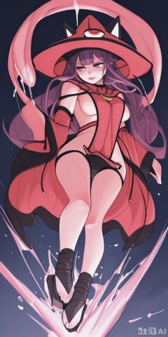 ,close-up,foot focus, 1girl,huge_breasts,looking_at_viewer,tiptoes,fighting_stance,bents knees, long hair,expressive_clothes,slutty clothes,wide_sleeves,reaching arm,barefoot, plasma splatter,Energy Blast,slashing,,masterpiece, best quality, absurdres, newest, very aesthetic, amazing quality,highres,sensitive,hyper detailed, (dynamic pose:1.4)karakasaobakemge, karakasa obake,karakasa obake, monster girl, oil-paper umbrella, large tongue, extra tongue, umbrella tongue, saliva trail,karakasaobakemge, long hair, purple hair, brown eyes, red umbrella,sideless outfit, red cape, tengu-geta, ankle wrap, vrist cuffs