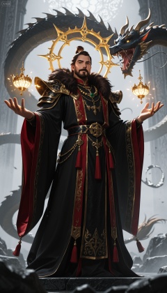 masterpiece, best quality, amazing quality, very aesthetic, high resolution, ultra-detailed, absurdres, newest, scenery, 3D, rendered, {Prompt}, BREAK, depth of field, volumetric lighting,1boy, solo, male focus, full body, king, emperor, standing, black robe, chinese clothes, long sleeves, wide sleeves, gold trim, red trim, ornate clothes, crown, beard, mustache, brown hair, topknot, arms outstretched, open palms, halo, glowing, dragon, shoulder armor, black fur, fur trim, belt, ornate belt, sash, tassel, jewelry, necklace, ring, jade, scale mail, looking at viewer, grey background, digital art,, Negative prompt: modern,recent,old,oldest,cartoon,graphic,text,painting,crayon,graphite,abstract,glitch,deformed,mutated,ugly,disfigured,long body,lowres,bad anatomy,bad hands,missing fingers,extra digits,fewer digits,cropped,very displeasing,(worst quality, bad quality:1.2),bad anatomy,sketch,jpeg artifacts,signature,watermark,username,simple background,conjoined,bad ai-generated,NSFW,,nsfw, Steps: 20, Sampler: Euler a, CFG scale: 4.5, Seed: 3755123486, Size: 768x1344, Model hash: 4c90572378, Model: 3DCG美女_illustrious🔮_v1.safetensors, Denoising strength: 0.5, Clip skip: 2, ENSD: 31337, RNG: CPU, vae_name: automatic, Hires resize: 1152x2016, Hires steps: 30, Hires upscaler: 4x-UltraSharp