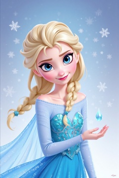 aiart_blade_edge,elsa (frozen),1girl,braid,blue eyes,solo,long hair,single braid,dress,blonde hair,snowflakes,looking at viewer,makeup,blue dress,red lips,smile,magic,watermark,ice,lipstick,
