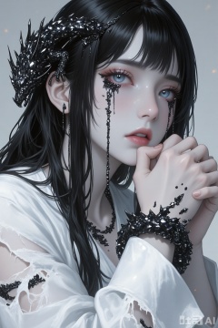 masterpiece, best quality, ultra-detailed, sharp focus, stigma_art, 1girl, pale face, sunken eyes, long black straight hair. She wears a torn white robe exposing her shoulders. Her eyes no longer shed tears, but instead weep solidified, black, glass-like crystals. These crystals solidify along her cheeks, forming grotesque tear tracks. An incredibly small Eastern dragon, formed from the aggregation of these black crystals, is coiled around her wrist, its body composed of countless tiny, faintly glimmering black crystals, with similar crystals constantly sliding off the dragon and merging with the tear tracks on her face. She clenches her hands, her expression pained and vacant.