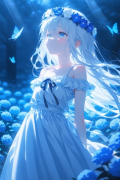 masterpiece,best quality,high quality,loli,chromatic_aberration,Blue Theme,artist:konya_karasue,//loli,night,gothic,long dress,1 girl,solo,long white hair,blue eyes,detailed eyes,blink and youll miss it detail,butterfly,flower garden,high quality,floral background,very detailed,off shoulder,//,official art,depth of field,detailed light,blurry background,cinematic lighting,ray tracing,ultra detailed,god rays,backlighting,photo background,film grain,chromatic aberration,volumetric lighting,depth of field,blurry background,shiny skin,floating hair,cinematic lighting,day,very aesthetic,cowboy shot,look up,head wreath,