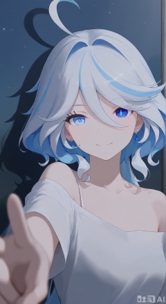 1girl, solo, long hair, looking at viewer, smile, bangs, blue eyes, shirt, hair between eyes, jewelry, closed mouth, blue hair, collarbone, white shirt, upper body, ahoge, white hair, multicolored hair, earrings, sky, off shoulder, streaked hair, night, star \(sky\), night sky, starry sky, off-shoulder shirt,furina,