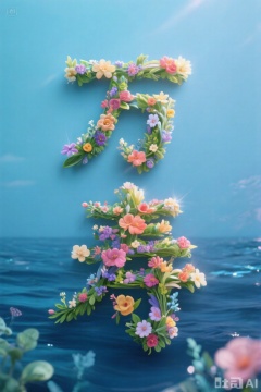 由鲜花构成的汉字"万寿",Flower characters,背景是海洋