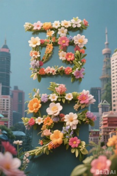 由鲜花构成的汉字"西安",Flower characters,背景是西安城市缩影