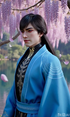 (masterpiece,best quality:1.23), a graceful young man in Hanfu, jet-black long hair, peach blossom forest, lakeside, falling petals, wisteria,Xzhanyihanli,Xhanlaomo,Xhanlizhanyi,Xhanlichangfu,XhanyiYYQ,Xhanliyuanying,Xziteng,Xxuanguxiaocha,Xxiaochaxuangu
