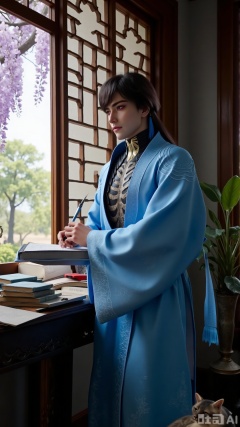 (masterpiece,best quality:1.23),ancient Chinese youth, tall and slender, hanfu, writing with a brush, inside a scholarly study with a wisteria window view, scrolls and books, soft shadows, peaceful atmosphere,,XyunxiaoYH5,,Xbigbreasts,XMedusaQueen,Xzitenghua,Xxunyicaohua,Xhuayunfei,Xxiaochaxuangu,Xxuanguxiaocha,Xxuedixuenu,Xyunwangshuchengzhu