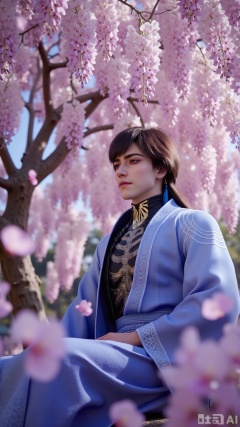 (masterpiece,best quality:1.23),ancient Chinese youth, tall and slender, hanfu, sitting under a cherry blossom tree and wisteria, falling petals, soft focus, out-of-focus background, dreamlike and romantic,,,,XyunxiaoYH5,,Xbigbreasts,XMedusaQueen,Xzitenghua,Xxunyicaohua,Xhuayunfei,Xxiaochaxuangu,Xxuanguxiaocha,Xxuedixuenu,Xyunwangshuchengzhu