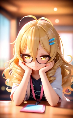 masterpiece,absurdres,best quality,loli,petite,high quality,chromatic_aberration,//,1girl,solo,petite,loli,long hair,long wavy curly hair,blonde_hair,yellow_eyes,antenna hair clips,bangs,hair between eyes,lab coat,focus,hands on own face,head rest,t-shirt,hands on own cheeks,closed mouth,half-closed.eyes,lanyard,black-framed eyewear,elbows on table,blurry,short sleeves,upper body,smile,:3,(8 years old girl with the flowing hair),(cute atmosphere),//,Depth of field,(colorful),hdr,Tyndall effect,depth of field,Tyndall Effect,blurry,blurry_background,depth_of_field,bokeh,glowing,//,<lora:MMDguangwuran5——【noob】hans:1>,