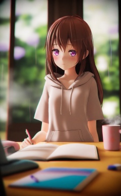 masterpiece,absurdres,best quality,loli,petite,high quality,chromatic_aberration,//,eraser, 1girl, brown_hair, long_hair, mug, hood, blush, hoodie, pencil, cup, purple_eyes, flower, blurry, solo, blurry_foreground, short_sleeves, indoors, steam, hood_down, plant, closed_mouth, table, coffee_mug, brown_hoodie, notebook, depth_of_field, rain, pen, looking_at_viewer, mechanical_pencil, upper_body, pencil_case, desk, white_hoodie, coffee//,3d,Depth of field,(colorful),hdr,Tyndall effect,depth of field,Tyndall Effect,blurry,blurry_background,depth_of_field,bokeh,glowing,//,<lora:MMDguangwuran5——【noob】hans:1>,