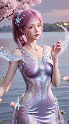 (masterpiece, best quality:1.2),1girl, navel, solo, midriff, bare shoulders, hair ornament,(long hair),(High double ponytail:1.49), red lips, BREAK, (looking at viewer:1.39), chinese clothes,(Holographic long dress:1.36), (lace,Rainbow Gradient Color:1.28), BREAK,blurry, solo focus, long hair, lips, daytime, lipstick, outdoors, standing,upper body,(huge breasts:2.89), background, solo, makeup,(Liquid glass style flowers:1.49),(huge breasts:2.99),(full breasts:2.99),,(Background with lotus pond and pink lotus flowers:1.39),XXaili2,XyunxiaoYH5,XlinziyueXZ,XtuliH,Xbigbreasts,XMedusaQueen,Xmiaozushaonv,Xkejinnvdi,Xbijinvshen,Xxihechengzhu,Xyunwangshuchengzhu,Xxuedixuenu,Xxuenvxuedi