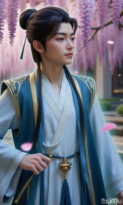 (masterpiece,best quality:1.23),ancient Chinese youth, tall and slender, hanfu, sitting under a cherry blossom tree and wisteria, falling petals, soft focus, out-of-focus background, dreamlike and romantic,,,Xzhanyihanli,Xhanlaomo,Xhanlizhanyi,Xhanlichangfu,XhanliYY,Xhanliyuanying