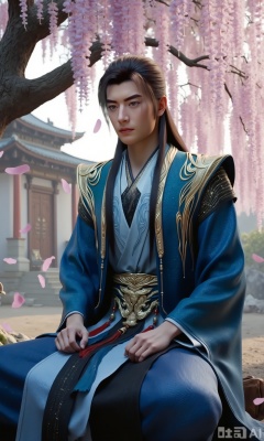 (masterpiece,best quality:1.23),ancient Chinese youth, tall and slender, hanfu, sitting under a cherry blossom tree and wisteria, falling petals, soft focus, out-of-focus background, dreamlike and romantic,,,Xzhanyihanli,Xhanlaomo,Xhanlizhanyi,Xhanlichangfu,XhanliYY,Xhanliyuanying