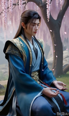 (masterpiece,best quality:1.23),ancient Chinese youth, tall and slender, hanfu, sitting under a cherry blossom tree and wisteria, falling petals, soft focus, out-of-focus background, dreamlike and romantic,,,Xzhanyihanli,Xhanlaomo,Xhanlizhanyi,Xhanlichangfu,XhanliYY,Xhanliyuanying