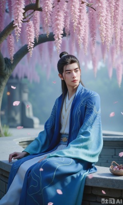 (masterpiece,best quality:1.23),ancient Chinese youth, tall and slender, hanfu, sitting under a cherry blossom tree and wisteria, falling petals, soft focus, out-of-focus background, dreamlike and romantic,,,Xzhanyihanli,Xhanlaomo,Xhanlizhanyi,Xhanlichangfu,XhanliYY,Xhanliyuanying