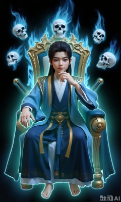 (masterpiece,best quality:1.23), 1boy, The character is dressed in a traditional outfit, consisting of a light blue robe with intricate patterns and a black inner garment featuring a skeletal design. The character has long black hair and striking eyes shadow.The image depicts a regal figure seated on an ornate throne, surrounded by swirling blue flames. The throne is intricately designed with gold accents, and the figure has long black hair. Floating around the figure are several white skulls, adding a mysterious and eerie atmosphere to the scene. The background is dark, enhancing the contrast with the glowing blue flames and the figure's attire.One hand rests on the chin, with a very playful expression, Sitting on a throne made of skulls and swords, with a spooky background,,,Xzhanyihanli,Xhanlaomo,Xhanlizhanyi,Xhanlichangfu,XhanliYY,Xhanliyuanying