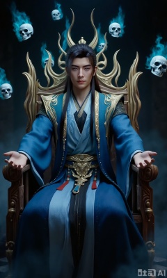 (masterpiece,best quality:1.23), 1boy, The character is dressed in a traditional outfit, consisting of a light blue robe with intricate patterns and a black inner garment featuring a skeletal design. The character has long black hair and striking eyes shadow.The image depicts a regal figure seated on an ornate throne, surrounded by swirling blue flames. The throne is intricately designed with gold accents, and the figure has long black hair. Floating around the figure are several white skulls, adding a mysterious and eerie atmosphere to the scene. The background is dark, enhancing the contrast with the glowing blue flames and the figure's attire.One hand rests on the chin, with a very playful expression, Sitting on a throne made of skulls and swords, with a spooky background,,,Xzhanyihanli,Xhanlaomo,Xhanlizhanyi,Xhanlichangfu,XhanliYY,Xhanliyuanying
