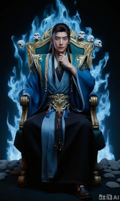 (masterpiece,best quality:1.23), 1boy, The character is dressed in a traditional outfit, consisting of a light blue robe with intricate patterns and a black inner garment featuring a skeletal design. The character has long black hair and striking eyes shadow.The image depicts a regal figure seated on an ornate throne, surrounded by swirling blue flames. The throne is intricately designed with gold accents, and the figure has long black hair. Floating around the figure are several white skulls, adding a mysterious and eerie atmosphere to the scene. The background is dark, enhancing the contrast with the glowing blue flames and the figure's attire.One hand rests on the chin, with a very playful expression, Sitting on a throne made of skulls and swords, with a spooky background,,,Xzhanyihanli,Xhanlaomo,Xhanlizhanyi,Xhanlichangfu,XhanliYY,Xhanliyuanying