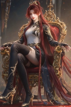 A highly detailed digital painting of a beautiful,fair-skinned woman with long,flowing red hair,adorned with a golden crown. She wears an intricate,black and white,high-collared dress with dragon motifs.Wearing black thigh-high boots,the thigh-high boots wrapped around her plump thighs,showing off her perfect and sexy curves. She wore black high heels with golden wing decorations on the shoes,, She sits on a luxurious golden throne,her legs crossed at the ankles and one leg hanging down. Her left arm rests on the armrest,while her right hand gently holds her chin. Her posture is elegant and poised,exuding confidence and grace. The scene is illuminated by dramatic lighting that highlights the gold accents of her attire and the intricate details of the throne. Soft shadows enhance the textures of the fabric and the surrounding ornate room,creating a luxurious and mystical atmosphere.,masterpiece,best quality,astonishing quality,ultimate aesthetics,absurd,best quality,ultimate aesthetics,masterpiece,emotional masterpiece,extraordinary above all,mastery of details,, best quality,astonishing quality,ultimate aesthetics,absurd,best quality,ultimate aesthetics,masterpiece,emotional masterpiece,extraordinary above all,mastery of details,, Negative prompt: ng_deepnegative_v1_75t,(badhandv4:1.2),EasyNegative,(worst quality:2),,nsfw, Steps: 30, Sampler: DPM++ 2M, CFG scale: 3.5, Seed: 4096989392, Size: 1024x1536, Model hash: 062dad72b2, Model: 麦橘超然majicFlus_v1.safetensors, Denoising strength: 0, RNG: CPU, Lora 1: 20250819-1755611835291-0011, Lora Hash 1: 4a4e21aeb4, Lora Weight 1: 1.0, Lora 2: 《金芒逸凤》唯美古风主题风格化lora|摄影|海报设计, Lora Hash 2: 779d600c15, Lora Weight 2: 0.8, vae_name: automatic