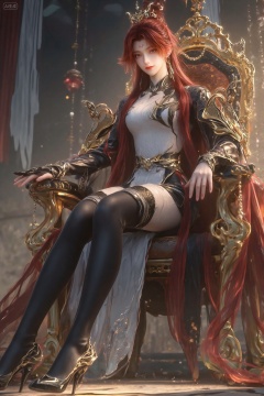 A highly detailed digital painting of a beautiful,fair-skinned woman with long,flowing red hair,adorned with a golden crown. She wears an intricate,black and white,high-collared dress with dragon motifs.Wearing black thigh-high boots,the thigh-high boots wrapped around her plump thighs,showing off her perfect and sexy curves. She wore black high heels with golden wing decorations on the shoes,, She sits on a luxurious golden throne,her legs crossed at the ankles and one leg hanging down. Her left arm rests on the armrest,while her right hand gently holds her chin. Her posture is elegant and poised,exuding confidence and grace. The scene is illuminated by dramatic lighting that highlights the gold accents of her attire and the intricate details of the throne. Soft shadows enhance the textures of the fabric and the surrounding ornate room,creating a luxurious and mystical atmosphere.,masterpiece,best quality,astonishing quality,ultimate aesthetics,absurd,best quality,ultimate aesthetics,masterpiece,emotional masterpiece,extraordinary above all,mastery of details,, best quality,astonishing quality,ultimate aesthetics,absurd,best quality,ultimate aesthetics,masterpiece,emotional masterpiece,extraordinary above all,mastery of details,, Negative prompt: ng_deepnegative_v1_75t,(badhandv4:1.2),EasyNegative,(worst quality:2),,nsfw, Steps: 30, Sampler: DPM++ 2M, CFG scale: 3.5, Seed: 4096989393, Size: 1024x1536, Model hash: 062dad72b2, Model: 麦橘超然majicFlus_v1.safetensors, Denoising strength: 0, RNG: CPU, Lora 1: 20250819-1755611835291-0011, Lora Hash 1: 4a4e21aeb4, Lora Weight 1: 1.0, Lora 2: 《金芒逸凤》唯美古风主题风格化lora|摄影|海报设计, Lora Hash 2: 779d600c15, Lora Weight 2: 0.8, vae_name: automatic