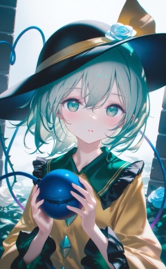 masterpiece,very aware,highres,absurdres,newest,best quality,loli,petite,high quality,chromatic_aberration,cinematic_angle,dutch angle,//,artist:konya_karasue,artist:Kinty,artist:tinker bell,artist:ciloranko,artist:ningen_mame,artist:sho_(sho_lwlw),artist:rhasta,artist:ke-ta,artist:hiten \(hitenkei\),//, 1girl, komeiji koishi, hat, solo, green eyes, flower, third eye, rose, wide sleeves, long sleeves, frills, black headwear, looking at viewer, yellow shirt, frilled sleeves, shirt, upper body, green hair, bubble, blue flower, hat flower, yellow bow, frilled shirt collar, blue rose, white flower, bow, hair between eyes, hat ribbon, parted lips, holding, hat bow, white rose, short hair, ribbon, medium hair, buttons, blouse, hands up, yellow ribbon, eyeball, plant, fingernails, vines, diamond button, leaf, thorns, floral print, soap bubbles, collared shirt, expressionless, koishi day, heart, open mouth, brick wall, blush <lora:amei4-000025:0.8>