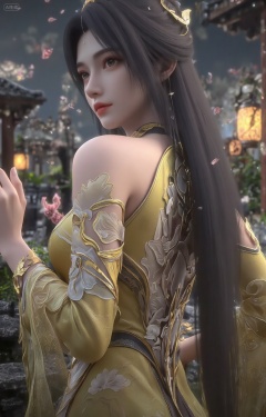 This is a highly detailed CGI rendering of a beautiful,fair-skinned woman with long,dark hair adorned with gold and white accessories. She wears an elaborate,golden-yellow dress with intricate floral patterns and a choker. Her expression is serene,with a slight smile. The background is a blurred,dark blue gradient.,, The scene is a serene ancient Chinese courtyard captured in a **low-angle wide shot**,where raindrops dynamically splash against stone pathways and lotus ponds in the foreground,creating ripples that reflect the soft glow of lanterns. The **middle ground** features traditional wooden pavilions with upturned eaves,their surfaces glistening under the rain,while **wisps of mist** drift between stone pillars and bonsai trees. In the **background**,beams of light pierce through the rain curtain,creating a **Dramine effect** that highlights the rain's texture and depth. The **sky** is a deep,moody gray,contrasting with the warm amber light spilling from paper lanterns,which casts elongated shadows and illuminates cascading rain in the air. The **crimson petals of plum blossoms** mingle with raindrops,adding vibrant splashes of color against the monochrome backdrop.,, masterpiece,best quality,astonishing quality,ultimate aesthetics,absurd,best quality,ultimate aesthetics,masterpiece,emotional masterpiece,extraordinary above all,mastery of details,, Negative prompt: ng_deepnegative_v1_75t,(badhandv4:1.2),EasyNegative,(worst quality:2),,nsfw, Steps: 30, Sampler: DPM++ 2M, CFG scale: 3.5, Seed: 854563991, Size: 768x1200, Model hash: 062dad72b2, Model: 麦橘超然majicFlus_v1.safetensors, Denoising strength: 0, RNG: CPU, Lora 1: 20250820-1755705975731-0010, Lora Hash 1: cf2836352b, Lora Weight 1: 1.0, Controlnet 0: "preprocessor: depth_anything, model: InstantX-FLUX.1-dev-Controlnet-Union-Pro-2.0, weight: 0.6, starting/ending: (0.0, 0.6), resize mode: Crop and Resize, pixel_perfect: False, control mode: Balanced, preprocessor params: (512, None, None)", vae_name: automatic
