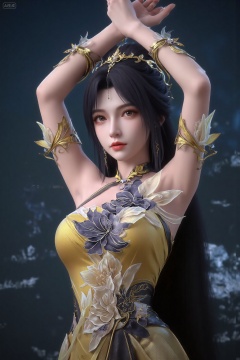 This is a highly detailed CGI rendering of a beautiful, fair-skinned woman with long, dark hair adorned with gold and white accessories. She wears an elaborate, golden-yellow dress with intricate floral patterns and a choker. Her expression is serene, with a slight smile. The background is a blurred, dark blue gradient., She stands with her back to the camera,arms raised above her head and hands crossed. Her posture is elegant and poised,with her body slightly turned to the side.,masterpiece,best quality,astonishing quality,ultimate aesthetics,absurd,best quality,ultimate aesthetics,masterpiece,emotional masterpiece,extraordinary above all,mastery of details,, Negative prompt: ng_deepnegative_v1_75t,(badhandv4:1.2),EasyNegative,(worst quality:2),,nsfw, Steps: 30, Sampler: DPM++ 2M, CFG scale: 3.5, Seed: 854563991, Size: 1024x1536, Model hash: 062dad72b2, Model: 麦橘超然majicFlus_v1.safetensors, Denoising strength: 0, RNG: CPU, Lora 1: 20250820-1755705975731-0010, Lora Hash 1: cf2836352b, Lora Weight 1: 1.0, Controlnet 0: "preprocessor: dw_openpose_full, model: InstantX-FLUX.1-dev-Controlnet-Union-Pro-2.0, weight: 0.7, starting/ending: (0.0, 0.7), resize mode: Crop and Resize, pixel_perfect: False, control mode: Balanced, preprocessor params: (512, None, None)", vae_name: automatic