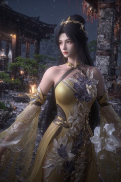 This is a highly detailed CGI rendering of a beautiful,fair-skinned woman with long,dark hair adorned with gold and white accessories. She wears an elaborate,golden-yellow dress with intricate floral patterns and a choker. Her expression is serene,with a slight smile. The background is a blurred,dark blue gradient.,, The scene is a serene ancient Chinese courtyard captured in a **low-angle wide shot**,where raindrops dynamically splash against stone pathways and lotus ponds in the foreground,creating ripples that reflect the soft glow of lanterns. The **middle ground** features traditional wooden pavilions with upturned eaves,their surfaces glistening under the rain,while **wisps of mist** drift between stone pillars and bonsai trees. In the **background**,beams of light pierce through the rain curtain,creating a **Dramine effect** that highlights the rain's texture and depth. The **sky** is a deep,moody gray,contrasting with the warm amber light spilling from paper lanterns,which casts elongated shadows and illuminates cascading rain in the air. The **crimson petals of plum blossoms** mingle with raindrops,adding vibrant splashes of color against the monochrome backdrop.,, masterpiece,best quality,astonishing quality,ultimate aesthetics,absurd,best quality,ultimate aesthetics,masterpiece,emotional masterpiece,extraordinary above all,mastery of details,, Negative prompt: ng_deepnegative_v1_75t,(badhandv4:1.2),EasyNegative,(worst quality:2),,nsfw, Steps: 30, Sampler: DPM++ 2M, CFG scale: 3.5, Seed: 854563991, Size: 1024x1536, Model hash: 062dad72b2, Model: 麦橘超然majicFlus_v1.safetensors, Denoising strength: 0, RNG: CPU, Lora 1: 20250820-1755705975731-0010, Lora Hash 1: cf2836352b, Lora Weight 1: 1.0, Controlnet 0: "preprocessor: dw_openpose_full, model: InstantX-FLUX.1-dev-Controlnet-Union-Pro-2.0, weight: 0.7, starting/ending: (0.0, 0.7), resize mode: Crop and Resize, pixel_perfect: False, control mode: Balanced, preprocessor params: (512, None, None)", vae_name: automatic