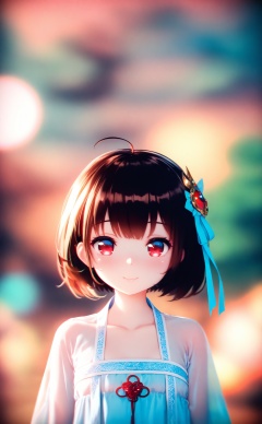 masterpiece,absurdres,best quality,loli,petite,high quality,chromatic_aberration,//,1girl,solo,red eyes,short hair,looking at viewer,hanfu,see-through,upper body,ahoge,brown hair,chinese clothes,smile,hair ornament,ribbon,blurry,closed mouth,depth of field,blue ribbon,black hair,collarbone,//,Depth of field,(colorful),hdr,Tyndall effect,depth of field,Tyndall Effect,blurry,blurry_background,depth_of_field,bokeh,glowing,//,<lora:MMDguangwuran6——【noob】hans:0.9>,