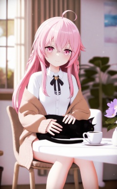 masterpiece,absurdres,best quality,loli,petite,high quality,chromatic_aberration,//,1girl,shirt,cup,white shirt,collared shirt,flower,cat,indoors,window,pink hair,holding,looking at viewer,animal on lap,smile,braid,sitting,pink eyes,on lap,hair between eyes,ahoge,holding cup,solo,long hair,long sleeves,black cat,open clothes,closed mouth,crossed bangs,glasses,chair,neck ribbon,blue flower,brown jacket,off shoulder,curtains,jacket,plant,mug,blush,potted plant,ribbon,on chair,sunlight,open jacket,blurry,black ribbon,sidelocks,unworn eyewear,cardigan,brown cardigan,book,vase,pink flower,coffee mug,purple flower,breasts,table,petting,//,Depth of field,(colorful),hdr,Tyndall effect,depth of field,Tyndall Effect,blurry,blurry_background,depth_of_field,bokeh,glowing,//,<lora:MMDguangwuran6——【noob】hans:0.9>,