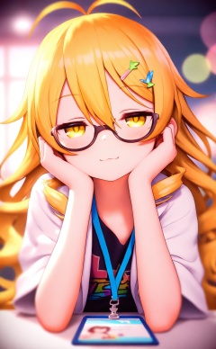 masterpiece,absurdres,best quality,loli,petite,high quality,chromatic_aberration,//,1girl,solo,petite,loli,long hair,long wavy curly hair,blonde_hair,yellow_eyes,antenna hair clips,bangs,hair between eyes,lab coat,focus,hands on own face,head rest,t-shirt,hands on own cheeks,closed mouth,half-closed.eyes,lanyard,black-framed eyewear,elbows on table,blurry,short sleeves,upper body,smile,:3,(8 years old girl with the flowing hair),(cute atmosphere),//,Depth of field,(colorful),hdr,Tyndall effect,depth of field,Tyndall Effect,blurry,blurry_background,depth_of_field,bokeh,glowing,//,<lora:MMDguangwuran6——【noob】hans:0.9>,