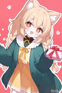 1girl, :d, animal ear fluff, animal ears, blonde hair, blush, braid, cardigan, cat ears, cat girl, chibi, collared dress, contrast collar, cowboy shot, double-parted bangs, dress, frilled shirt collar, frills, gift, green cardigan, hair between eyes, holding, holding gift, long hair, long sleeves, looking at viewer, mismatched pupils, open cardigan, open clothes, open mouth, outline, polka dot, polka dot background, red eyes, smile, star-shaped pupils, star \(symbol\), symbol-shaped pupils, twin braids, white outline, yellow dress