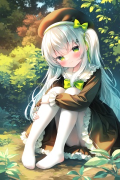 best,1girl,pantyhose,green eyes,solo,white pantyhose,hat,outdoors,tree,smile,no shoes,long hair,looking at viewer,dress,bow,blush,sitting,beret,frills,hugging own legs,white hair,feet,hair ornament,closed mouth,knees up,frilled dress,black headwear,black dress,hat bow,day,plant,long sleeves,grey hair,ribbon,green bow,toes,full body,very long hair,frilled shirt collar,one side up,musical note hair ornament,legs,frilled sailor collar,hairclip,musical note,hair between eyes,on ground,hair ribbon,grass,head tilt,leaf,nature,hair bow,brown headwear,bowtie,side ponytail,bush,green ribbon,hat ribbon,forest,thighband pantyhose,sailor dress,yellow bow,<lora:gzc3lokr-000037:0.8>,