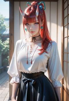 masterpiece,best quality,very aesthetic,intricate detail,sharp focus,absurdres,high resolution,newest,realistic,photorealistic,1girl,solo,long hair,oni horns,ponytail,bangs,eyelashes,shirt,skirt,long sleeves,ribbon,white shirt,short sleeves,black skirt,jewelry,earrings,hair ornament,looking at viewer,