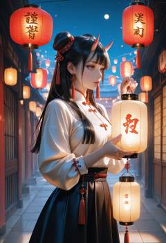 masterpiece,best quality,very aesthetic,intricate detail,sharp focus,absurdres,high resolution,newest,realistic,photorealistic,1girl,solo,long hair,oni horns,black hair,hair bun,double bun,eyelashes,looking at lantern,holding lantern,shirt,skirt,long sleeves,ribbon,white shirt,short sleeves,black skirt,puffy short sleeves,chinese clothes,jewelry,tassel,earrings,tassel earrings,tassel hair ornament,lantern,paper lantern,glowing,night sky,