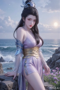 1girl,mature,solo facing away from the audience,big buttocks,plump,curvy,actress,idol,**** top,side slit,panorama,long eyelashes,very delicate makeup,showcasing buttocks and genital area,sfw,close-up shooting,Kodak camera,rich details,1 woman,condole belt Chinese clothing,transparent material,cyberwear,a bikini made of silk,lace stockings,dragon scale decoration,high heels,on the seaside boulder,looking at the audience,stand with your back to the audience and squint,long legs,high ponytail,hair flying in the wind,looking_at_viewer,crystal beautiful illustration,guoman