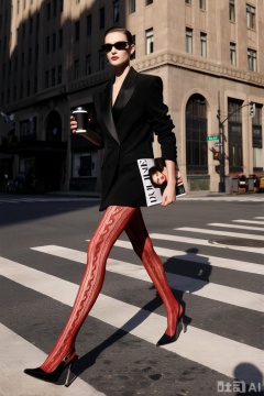 身材高挑,表情冷艳的模特,不对称剪裁的黑色西装,红色花纹丝袜,黑色12厘米细跟高跟鞋。大步流星地走在斑马线上,,拿着咖啡,顶级时尚杂志街拍风格,,繁华的时尚都市街头,使用硬朗的建筑光影,搭配强烈的侧光,在面部形成鲜明明暗对比,构图是全身特写,从仰视角拍摄,背景保留城市建筑线条感,高清画质。masterpiece, best quality
