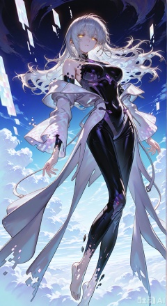 1girl,solo,white hair,messy hair,yellow_eyes,orange pupils,glowing eyes,half-closed_eyes,purple_gemstone ,(black_bodysuit,white_jacket,off-shoulder_bikini,bare_shoulders,large_breasts) ,(square pattern,square patterned sleeves,rectangle,disintegration clothing,digital_dissolved clothing,deconstructed clothing,fading outfit),barefoot,