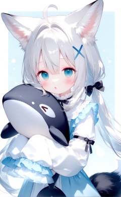 alens,1girl, animal ears, hair ornament, white hair, blue eyes, long hair, sleeves past fingers, sleeves past wrists, tail, bow, ahoge, looking at viewer, x hair ornament, twintails, low twintails, animal ear fluff, solo, blush, long sleeves, hair bow, fox ears, blue bow, :o, fox girl, upper body, shirt, white shirt, hugging object, blue background, fox tail, parted lips, chestnut mouth, open mouth, hair between eyes, >_<, dress, black bow, simple background, two-tone background, white background, very long hair, open clothes, white border, sidelocks, border, frilled sleeves, grey hair, aqua eyes, hairclip, hair intakes, frills, dot nose, stuffed toy, virtual youtuberarm garter, orca<lora:Alens zz up-000021:0.8>
