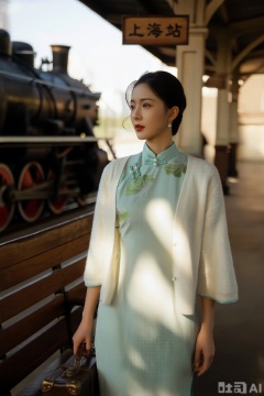 优雅东方女性的上半身,她身着民国风格的淡青色新中式短袄,立领处缀着三颗白色珍珠盘扣,衣襟两侧绣着浅绿荷叶纹,叶脉用细银线勾勒,外搭一件米白色针织小坎肩。场景设定在民国火车站的木质候车长椅旁,背景可见复古蒸汽火车的烟囱与“上海站” 字样的木质站牌,整体为复古电影写真风格。借助午后的自然光,光线带着暖黄调,穿过车站顶棚的缝隙在短袄上形成斑驳光影,以胶片颗粒感渲染增添年代感,色彩以淡青、米白与浅绿为主。采用三分法构图,从45 度侧拍视角捕捉人物手搭在皮质行李箱上、目光望向站台的瞬间,尽显民国女性的温婉与期待。masterpiece, best quality, amazing quality, very aesthetic, absurdres, highres,模糊动态背景