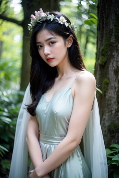 The image depicts a young woman adorned in a floral dress that seamlessly blends with the natural surroundings. Her attire is made up of various colorful flowers and leaves, creating a harmonious fusion with the lush greenery around her. She is wearing a crown of vibrant flowers on her head, enhancing her ethereal appearance. The background is a soft, blurred forest scene, with dappled sunlight filtering through the trees, creating a serene and magical atmosphere. The overall composition exudes a sense of harmony between nature and beauty.