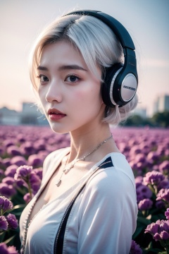A young Chinese woman,alone,short hair,Close-up,1girl,Without wearing any clothing,half body unbuttoned buttonabsurdres, futuristic world, cyberpunk, surreal rendering, a girl wearing headphones and tech VR glasses, wearing a silver reflective jacket, with flowers decorated on the headphones, looking very delicate, her hair is white with a pink-purple tone, she is wearing a necklace with floral patterns, surrounded by light blue-purple flowers, the background is a blurred sky, giving a dreamy feeling, the overall color is mainly pink and purple, creating a calm and mysterious atmosphere, influenced by cyberpunk and futurism, combining elements of technology and natural beauty, surrealist art