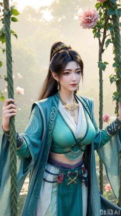 (masterpiece, best quality:1.2),In a cinematic shot with soft sunlight filtering through petals, a delicate fairy-like beauty swings gently on a flower swing amidst a whimsical garden. She wears a pale blue hanfu with flowing wide sleeves and a translucent silk sash tied around her slender figure. Her long black hair with blue highlights cascades down her back, adorned with a pearl hairpin. A gentle smile plays on her innocent eyes as she floats above the flowers, surrounded by fluttering butterflies and golden pollen particles. Magical runes float in the air, casting an ethereal glow. Vines wrap around the ropes of the swing, intertwined with roses and morning glories. The pastel color palette and fantasy atmosphere evoke a sense of wonder and enchantment.,(huge breasts:2.99),(full breasts:2.99),,Xbigbreasts,Xxinghuanwang001,XmupeulingHY3,XlujiajiaYH,XmupeulingHY2,XQueenMedusa