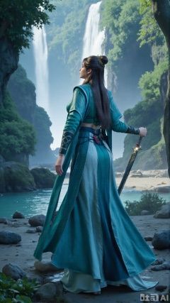 (masterpiece,best quality:1.23),Dominant sister-type girl, velvet ancient style long dress, perfect body, in a valley with a rushing waterfall, holding a long sword, sharp gaze, mist pervading, magnificent aura.(huge breasts, full breasts:2.99),,Xbigbreasts,Xxinghuanwang001,XmupeulingHY3,XlujiajiaYH,XmupeulingHY2,XQueenMedusa